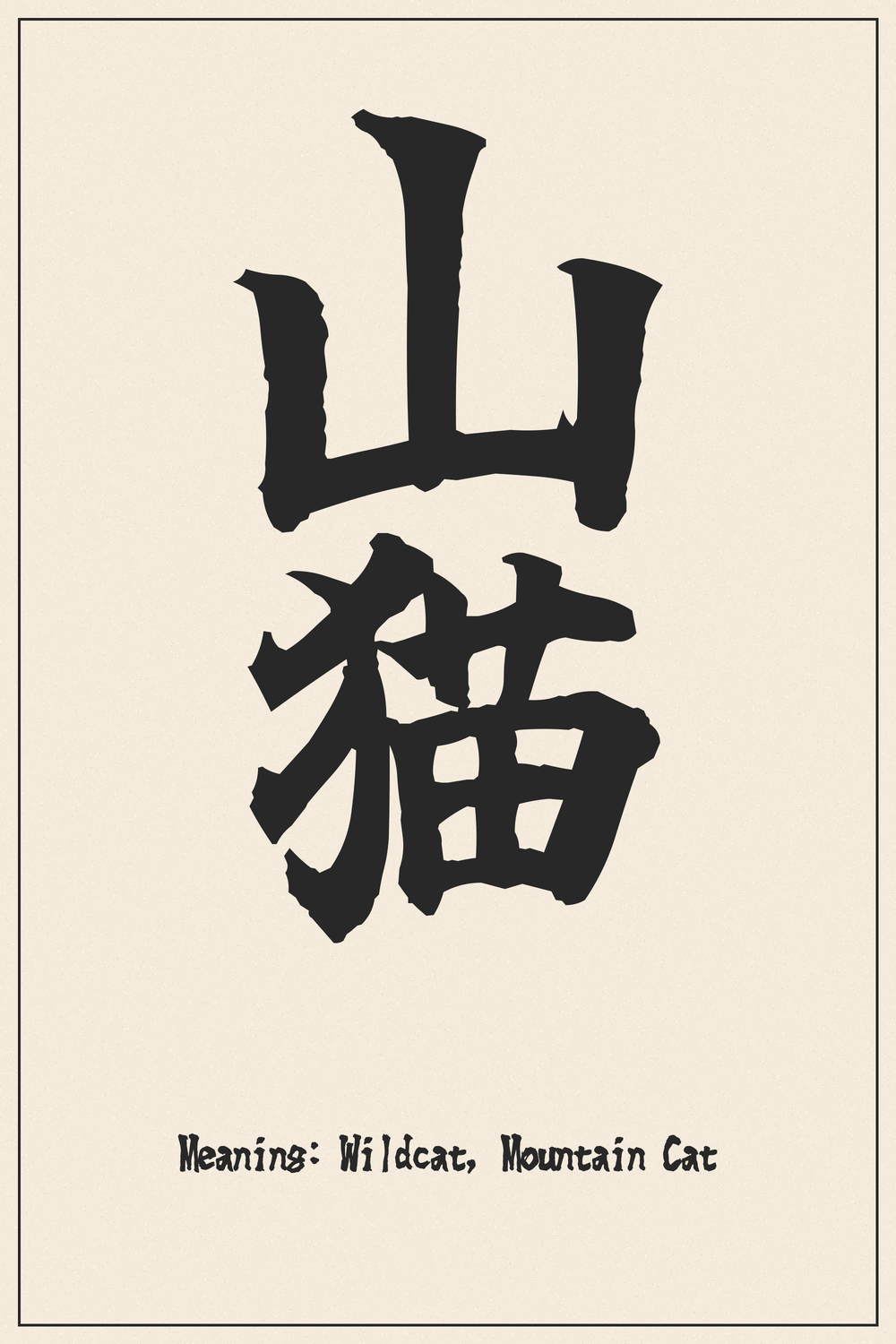 The Japanese term ‘Yamaneko’ (山猫) literally translates to ‘mountain cat,’ referring to various species of wild felines native to mountainous or remote regions. This compound Kanji accurately portrays an animal that thrives in rugged, untamed environments, embodying a spirit of wildness and self-reliance.