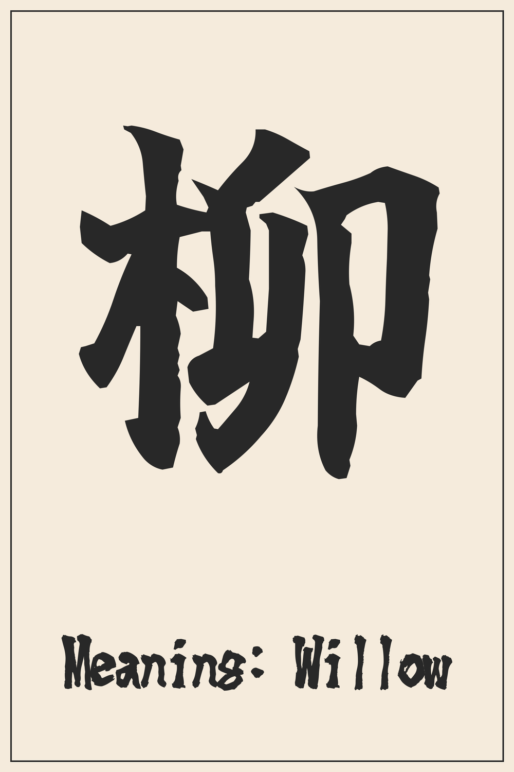 The Kanji 柳 embodies the serene elegance and enduring spirit of the willow tree. It speaks of adaptability and beauty, deeply rooted in both landscape and lore.