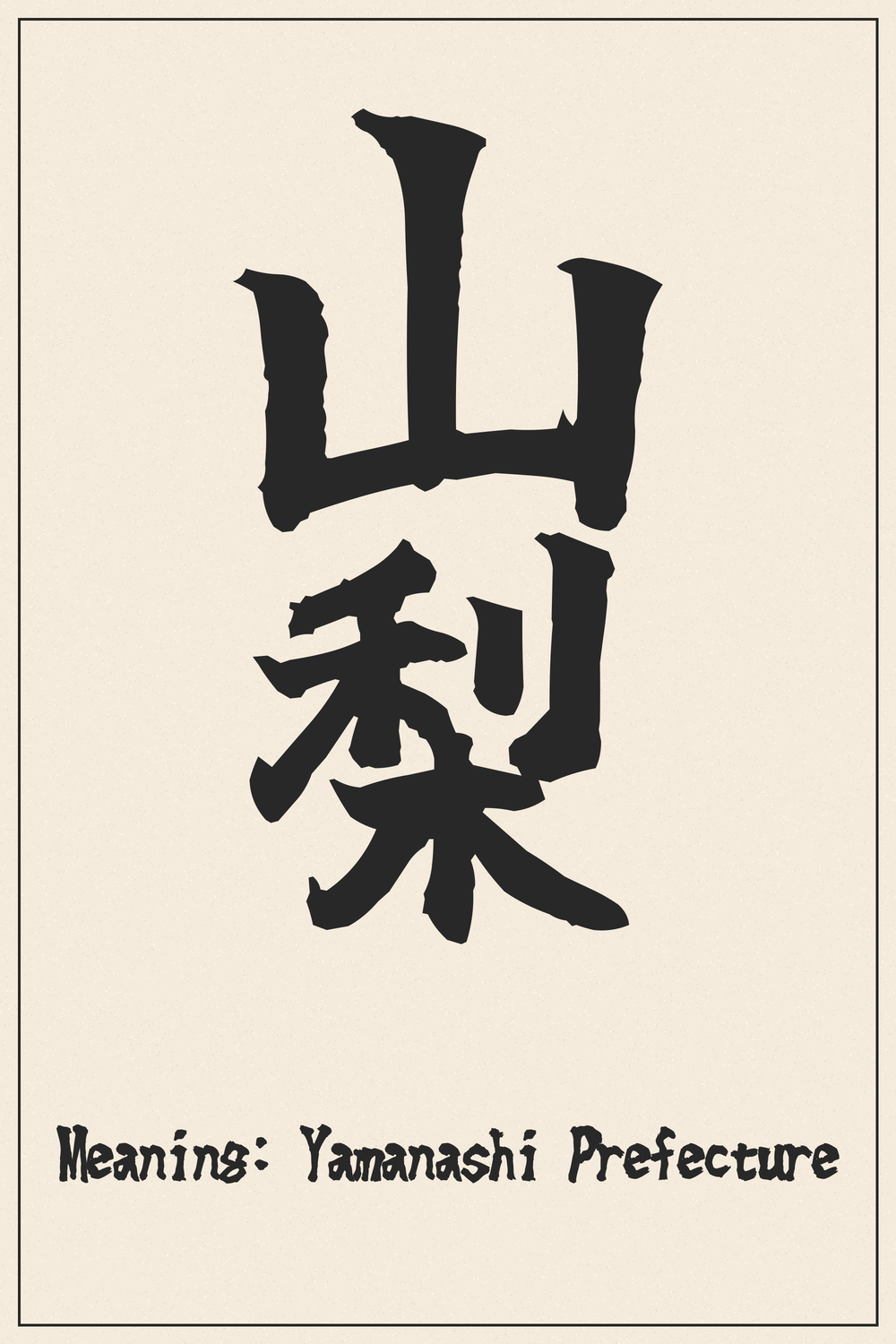 The Kanji ‘山梨’ captures the essence of a region defined by its majestic mountains and fertile lands, traditionally abundant in pear trees. It symbolizes a connection to Japan’s rich natural landscapes and its agricultural heritage, embodying both natural beauty and productivity.